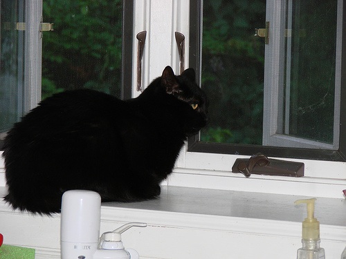 Here is Cliche sitting on one of the favored perches in the house — the bay window over our kitchen sink. Since they are not allowed on the counter, we do not know how they get up there. 😉